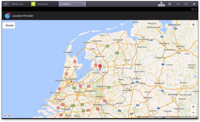 Een klik op dat icoontje opent een kaart, klik op een locatie en de rode speld wordt hier naartoe verplaatst. De APK-knop is handig als je onderdelen wilt installeren die niet uit de Google Play Store komen. Klik erop en vanuit de geopende verkenner kun je een APK-bestand installeren. Pas wel op voor malware, dit kan gemakkelijk verspreid worden door APK-bestanden, aangezien ze niet zijn goedgekeurd door de Google Play Store. Installeer dus alleen APK-bestanden van bronnen die je vertrouwt. Onder de APK-knop vind je ook nog knoppen voor het importeren van bestanden en het kopiëren en plakken van onderdelen. Zo kun je gemakkelijk bestanden van je pc naar je BlueStacks-systeem kopiëren en omgekeerd. De één-na-onderste knop regelt het volume en het vraagteken opent de helpbestanden in je browser.