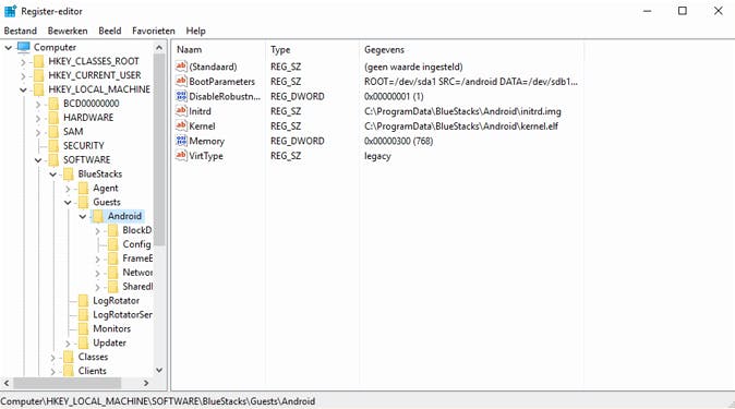 In Windows 10 klik je op het vergrootglas in je taakbalk, typ regedit in gevolgd door een Enter. Dit opent de Windows Register-editor. Op andere Windows-versies klik je op het startmenu en tik je daar regedit in de zoekbalk. Geef Windows toestemming om wijzigingen aan te brengen door op Ja te klikken. Ga naar HKEY_LOCAL_MACHINE/SOFTWARE/BLUESTACKS/GUESTS/ANDROID en dubbelklik op Memory aan de rechterkant. Zet het Grondtal op Decimaal en je ziet dat er onder Waardegegevens 768 staat. Vergroot dit aantal naar 1024. Zorg er altijd voor dat je niet meer dan de helft van je daadwerkelijke RAM-geheugen hier ingeeft, 1024 is gelijk aan 1 gigabyte. Sluit de Windows Register-editor af, herstart je pc en open BlueStacks opnieuw. Als je vervolgens bij de instellingen in BlueStacks kijkt, zie je dat je meer geheugen tot je beschikking hebt.