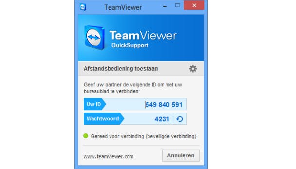 Dit programma heet TeamViewer Quicksupport. Een installatie is niet nodig, want je vriend hoeft alleen maar tweemaal op het exe-bestand te klikken. Daarna verschijnen een ID en wachtwoord in beeld. Met deze gegevens lukt het om zo dadelijk de gewenste bestanden naar deze pc te verzenden. Hiervoor heb je TeamViewer All-In-One nodig. Dit programma download je naar je eigen systeem.