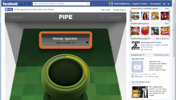 Betreed de webpagina en log in met je Facebook-account. Klik daarna op Naar app gaan en Go to app. Via FRIENDS geef je aan naar welke persoon je een bestand wil sturen. Klik op de pijplijn om Windows Verkenner te openen. Selecteer het juiste bestand en bevestig met Openen. Zodra je kiest voor Send file to locker bewaart Pipe het bestand drie dagen in een online kluis. Je Facebook-vriend heeft deze periode de gelegenheid om de data naar zijn of haar pc te downloaden.