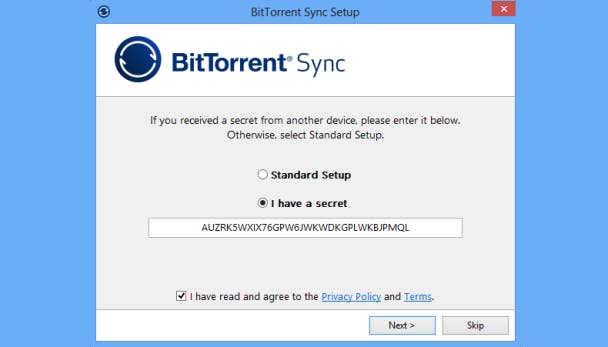 Bittorrent kent geen opslaglimiet. Ideaal dus om bijvoorbeeld zelfgemaakte films onder alle familieleden te verspreiden. Je gebruikt hiervoor het programma BitTorrent Sync. Ga naar de website en klik op de blauwe knop Get BitTorrent Sync. Voer het exe-bestand uit en klik op Next / Install om de installatie te voltooien. Bijzonder is dat het programma een zogeheten geheim (secret) koppelt aan de map die je wil delen. Eigenlijk is dat niets anders dan een codesleutel. Omdat je BitTorrent Sync waarschijnlijk voor het eerst gebruikt, kies je voor Standard Setup. Vink onderaan het selectiehokje aan en klik op Next. Geef aan welke map je wil delen.