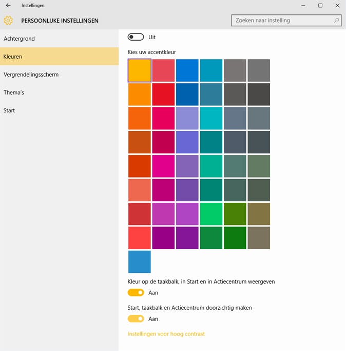 Tip 2 - Een eigen kleur voor het startmenu, taakbalk en actiecentrum.