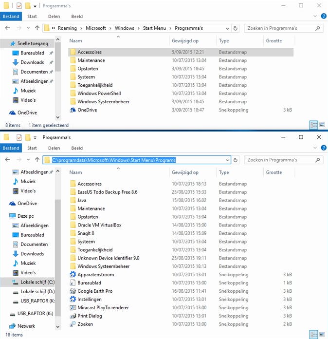 In Windows 10 zitten alle geïnstalleerde apps en programma's verenigd onder één enkele knop: Alle apps. Windows 10 regelt de opbouw van dit menu weliswaar vanuit een interne database, maar dat neemt niet weg dat je zelf een en ander kunt bijsturen. In Windows 7 ging dat nog heel gemakkelijk (rechtsklik in het startmenu op het item Alle programma's en kies vervolgens Openen of Alle gebruikers), in Windows 10 gaat het met een kleine omweg.