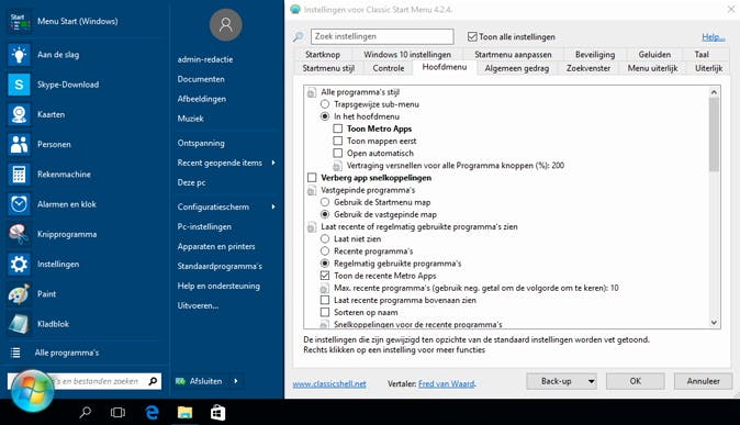 Wanneer je nu de Windows startknop indrukt, verschijnt een instellingenvenster van Classic Start Menu. Wil je terug naar het startmenu van Windows 7, stip dan Windows 7 style aan. Om ook de oude startknop ('orb') terug te krijgen, plaats je een vinkje bij Replace Start Button, stip je Custom aan, druk je op de knop Pick Image en verwijs je naar het png-bestand dat je hier kunt downloaden. Bevestig met OK. Je startmenu ziet er nu al helemaal anders en vertrouwder uit. Wil je tijdelijk toch terug naar het nieuwe startmenu van Windows 10, dan zorgt de combinatie Shift+Windows-toets daar wel voor.