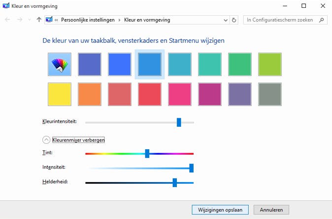 Liever een andere kleur? Dat kan eenvoudigweg via het Startmenu > Instellingen > Persoonlijke Instellingen > Kleuren. Schakel de optie Automatisch een accentkleur uit mijn achtergrond selecteren uit en kies de gewenste kleur. Een geheel eigen kleur kan ook: druk op Windows-toets+R en voer het commando rundll32.exe shell32.dll,Control_RunDLL desk.cpl,Advanced,@Advanced uit. Selecteer Kleurenmixer weergeven en maak gebruik van de schuifknoppen bij Tint, Intensiteit en Helderheid. Bevestig met Wijzigingen opslaan.