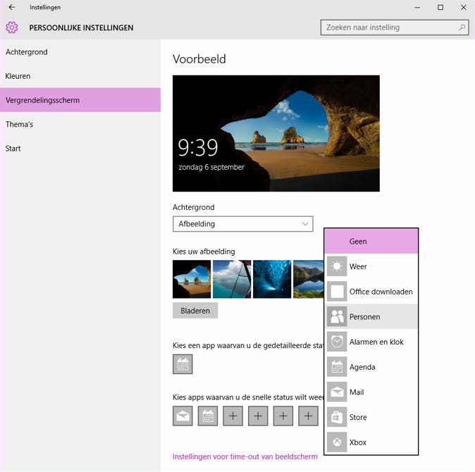 Standaard toont Windows op dit scherm een foto met een grot-en-zeezicht, maar die afbeelding laat zich makkelijk door een eigen exemplaar vervangen. Open het startmenu en kies Instellingen > Persoonlijke instellingen > Vergrendelingsscherm. Bij Achtergrond kun je nu kiezen tussen Afbeelding en Diavoorstelling en net daaronder kun je dan de gewenste afbeelding(en) selecteren. Verder geef je hier ook aan van welke apps je op dit vergrendelingsscherm een snelle of gedetailleerde status wilt zien.