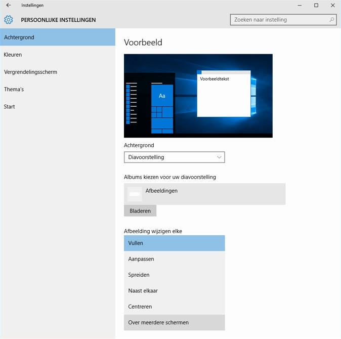Een eigen achtergrond instellen kan gelukkig nog steeds. Open via het startmenu weer de Instellingen > Persoonlijke instellingen en klik op Achtergrond. In het uitklapmenu bij Achtergrond krijg je drie opties: Afbeelding, Effen kleur of Diavoorstelling en afhankelijk van de gekozen optie verschijnen aangepaste keuzemogelijkheden.