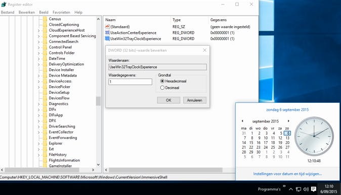 We beginnen met die van de datum- en tijdinstellingen. Start de registereditor weer op door regedit uit te voeren en navigeer naar HKEY_LOCAL_MACHINE\SOFTWARE\Microsoft\Windows\CurrentVersion\ImmersiveShell. Ga naar het menu Bewerken, kies DWORD (32 bits)-waarde en geef het item de naam UseWin32TrayClockExperience. Dubbelklik hierop en geef die de waarde 1 mee. Bevestig met OK en sluit regedit af. Het volstaat de 1 in 0 te wijzigen om weer de nieuwe klok-interface te zien.