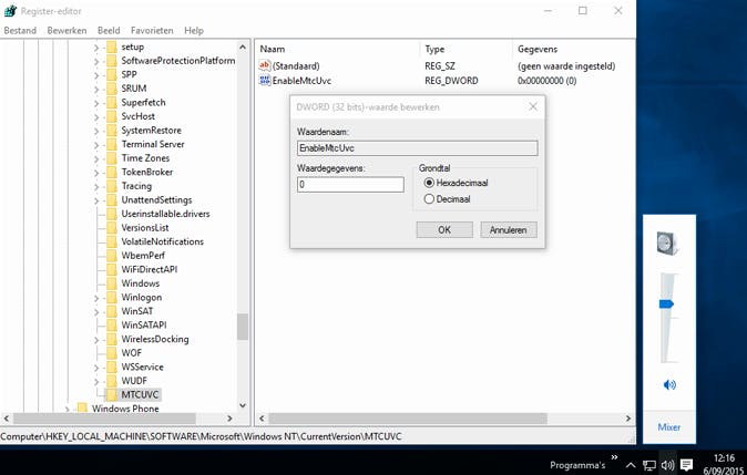 Ook wanneer je het luidsprekerpictogram aanklikt in het systeemvak van Windows 10 zie je een vernieuwd paneel verschijnen. Als je ook hiervoor liever het oude exemplaar terug hebt, blader je in de registereditor naar HKEY_LOCAL_MACHINE\SOFTWARE\Microsoft\Windows NT\CurrentVersion. Klik met de rechtermuisknop op deze sleutel en kies Nieuw / Sleutel. Geef die de naam MTCUVC. Open deze nieuwe sleutel en creëer een nieuwe DWORD (32 bits)-waarde. Noem die EnableMtcUvc en laat de waarde ingesteld op 0. Terugkeren naar de nieuwe volume-interface doe je door het item EnableMtcUvc weer te verwijderen.