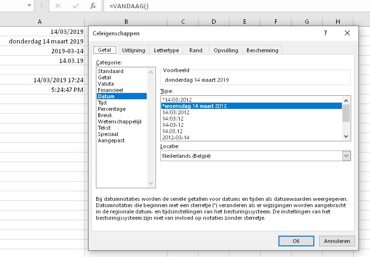 Ben je iemand die regelmatig vergeet zijn werk correct te dateren? De formule VANDAAG vult automatisch dag, maand en jaar in, terwijl de functie NU er zelfs de tijd tot op de minuut aan toevoegt. Je typt dan =VANDAAG() of =NU(). Deze functies zijn ook handig in een werkblad waar je een waarde wilt berekenen op basis van de huidige dag en tijd. Met een rechtsklik en de keuze voor Celeigenschappen kun je vervolgens de weergave van datum en tijd aanpassen. Om deze tijdsinformatie te updaten in het actieve werkblad druk je op Shift+F9; gebruik F9 om de hele werkmap te actualiseren.