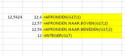 Excel heeft verschillende opties om af te ronden. De standaardafronding ziet eruit als =AFRONDING(getal; aantal decimalen). De formule =AFRONDING(12,5624;1) geeft als resultaat dus 12,6. Je vraagt immers om af te ronden naar één getal na de komma. Ook bij functie AFRONDEN.NAAR.BOVEN en AFRONDEN.NAAR.BENEDEN zal Excel afronden naar het aantal decimalen dat je opgeeft. =AFRONDEN.NAAR.BOVEN (12,5624;2) geeft dus als resultaat 12,57 en =AFRONDEN.NAAR.BENEDEN (12,5624;2) resulteert in 12,56. De functie INTEGER is eigenlijk ook een afrondfunctie, maar daarmee rondt Excel af naar het dichtstbijzijnde gehele getal.