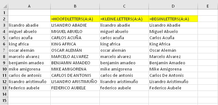 Om ervoor te zorgen dat in een kolom alles in hoofdletters verschijnt, gebruik je de functie HOOFDLETTERS. De formule KLEINE.LETTERS doet het tegenovergestelde. En wil je dat ieder woord met een hoofdletter begint gevolgd door kleine letters, dan gebruik je de functie BEGINLETTERS. De formule =KLEINE.LETTERS(B4) toont de inhoud van cel B4, maar dan in kleine letters.
