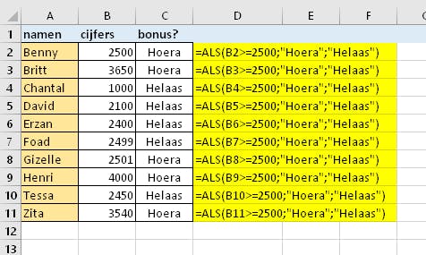 Wanneer een berekening afhankelijk is van bepaalde voorwaarden gebruik je de ALS-functie. Het principe van deze functie is: =ALS(voorwaarde; berekening als aan de voorwaarde wordt voldaan; andere gevallen). Om de voorwaarde te formuleren, gebruik je de tekens: = gelijk aan, <> niet gelijk aan, > meer dan, < minder dan, >= meer dan of gelijk aan, <= minder dan of gelijk aan. Veronderstel dat in een organisatie iedereen een bonus ontvangt die voor 25.000 euro of meer heeft verkocht. Bij wie een bonus ontvangt, zal automatisch het woord “Hoera” bij zijn naam verschijnen, is dat niet het geval, dan verschijnt het woord “Helaas”. De formule die je daarvoor nodig hebt is =ALS(B2>=2500;”Hoera”;”Helaas”).