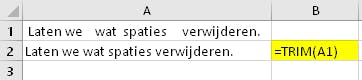 Met de functie TRIM wis je overbodige spaties in tekst. Deze functie laat enkele spaties tussen woorden ongemoeid, maar zal spaties voor of na het woord weghalen. =TRIM(celbereik) komt van pas bij tekst die is geïmporteerd vanuit een ander programma. In sommige versies van Excel heet deze functie SPATIES.WISSEN.