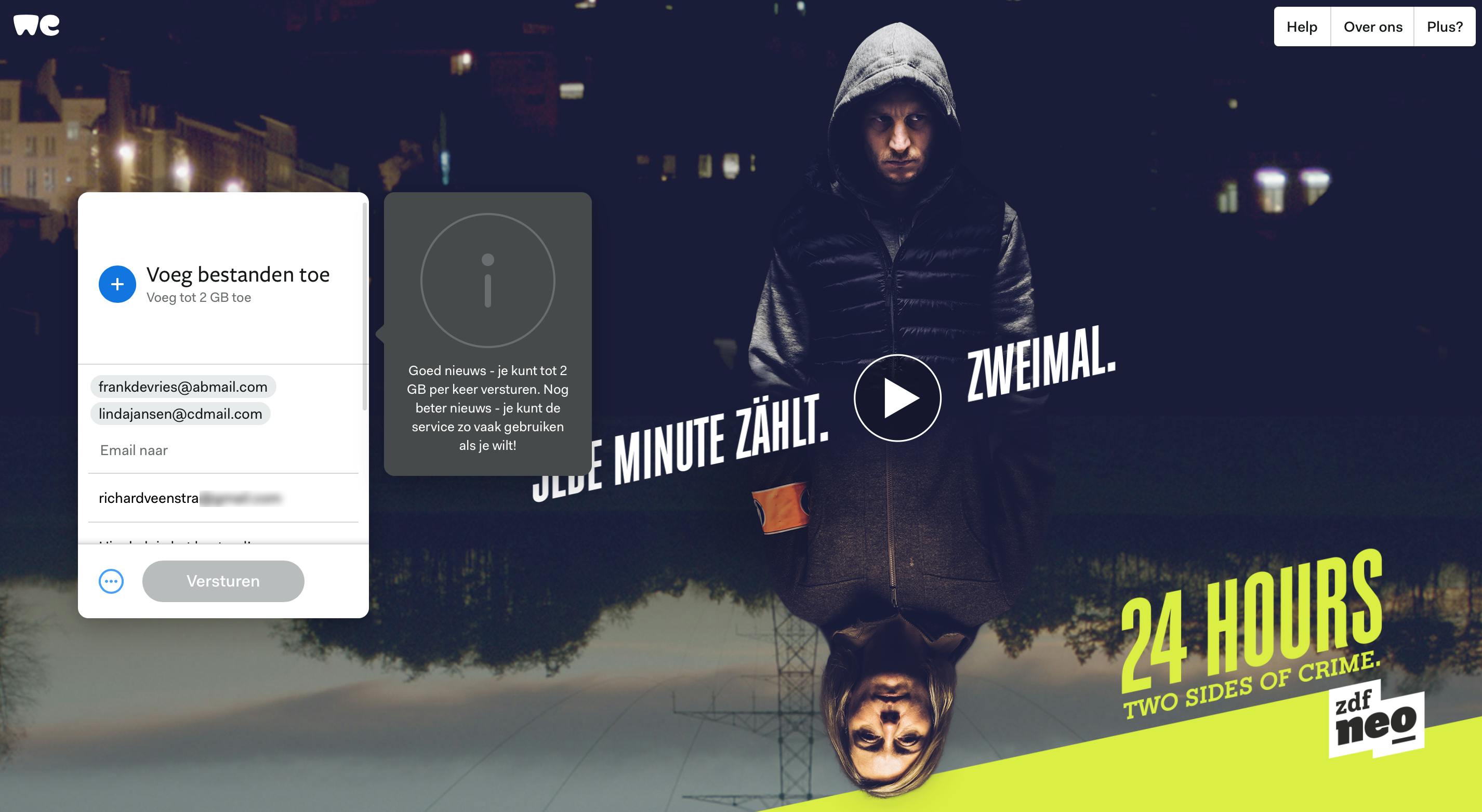 Wil je liever geen bestand versturen via Gmail vanwege privacy-bezwaren of omdat je simpelweg geen Google-account hebt, dan ben je aangewezen op een file transfer dienst. Het Nederlandse WeTransfer is een van de meest populaire opties. Eén of meerdere bestanden mogen in totaal maximaal 2 gigabyte groot zijn en je kunt ze naar meerdere mensen sturen. De bestanden blijven zeven dagen op de servers staan alvorens ze automatisch verwijderd worden.