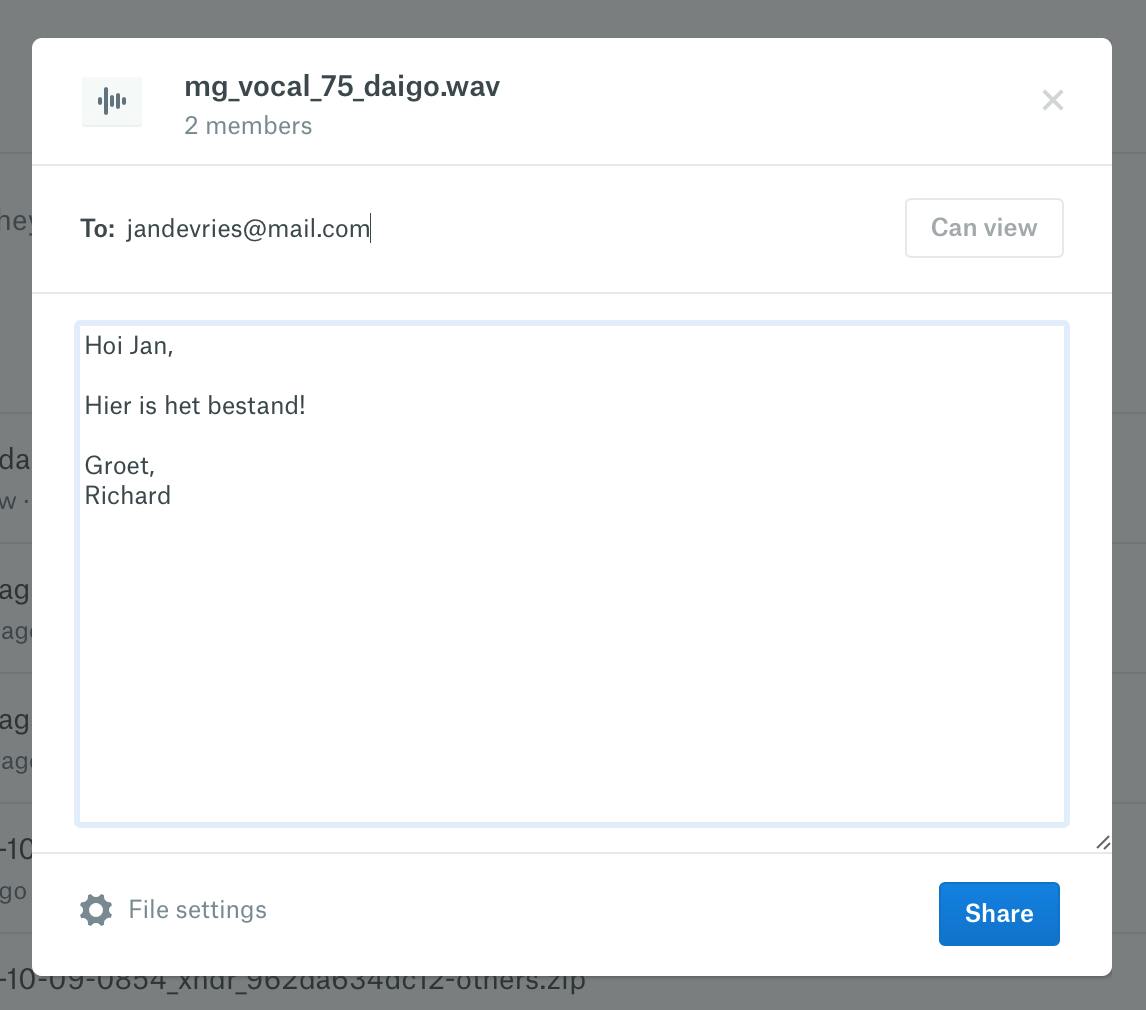 Met een Dropbox-account deel je gemakkelijk bestanden met anderen. Dit kan vanaf de website van de dienst door met je muis over op een bestand te bewegen en op de deel-knop te drukken. Geef een e-mailadres op en kies eventueel of de ontvanger het bestand mag bewerken (can edit). De ontvanger krijgt dan een mail en kan het bestand aan zijn of haar Dropbox-map toevoegen, bekijken of downloaden. Als je de Dropbox-app op je pc hebt geïnstalleerd, kun je, nog sneller, direct je bestanden delen vanuit de Windows Verkenner.