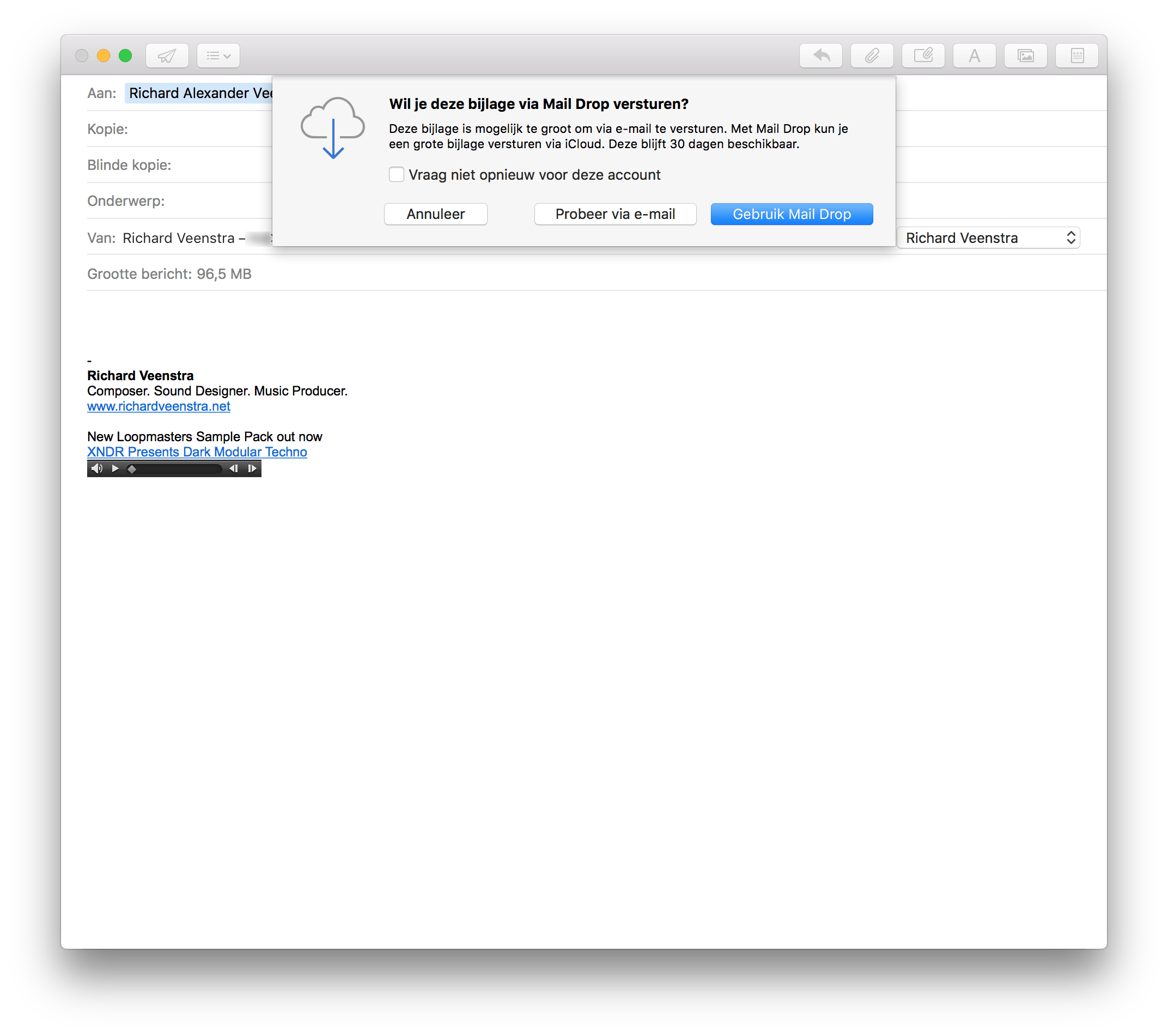 Als je een groot bestand via Apple Mail wilt versturen, dan geeft het programma aan of je dit via Mail Drop wilt doen. Mail Drop is een service van iCloud die het bestand dertig dagen in de cloud opslaat. Ontvangers kunnen het bestand gedurende deze tijd downloaden, na die dertig dagen wordt het bestand automatisch van de clouddienst verwijderd. Hoe groot het te versturen bestand mag zijn, hangt af van de vrije ruimte die je nog in je iCloud-account hebt.
