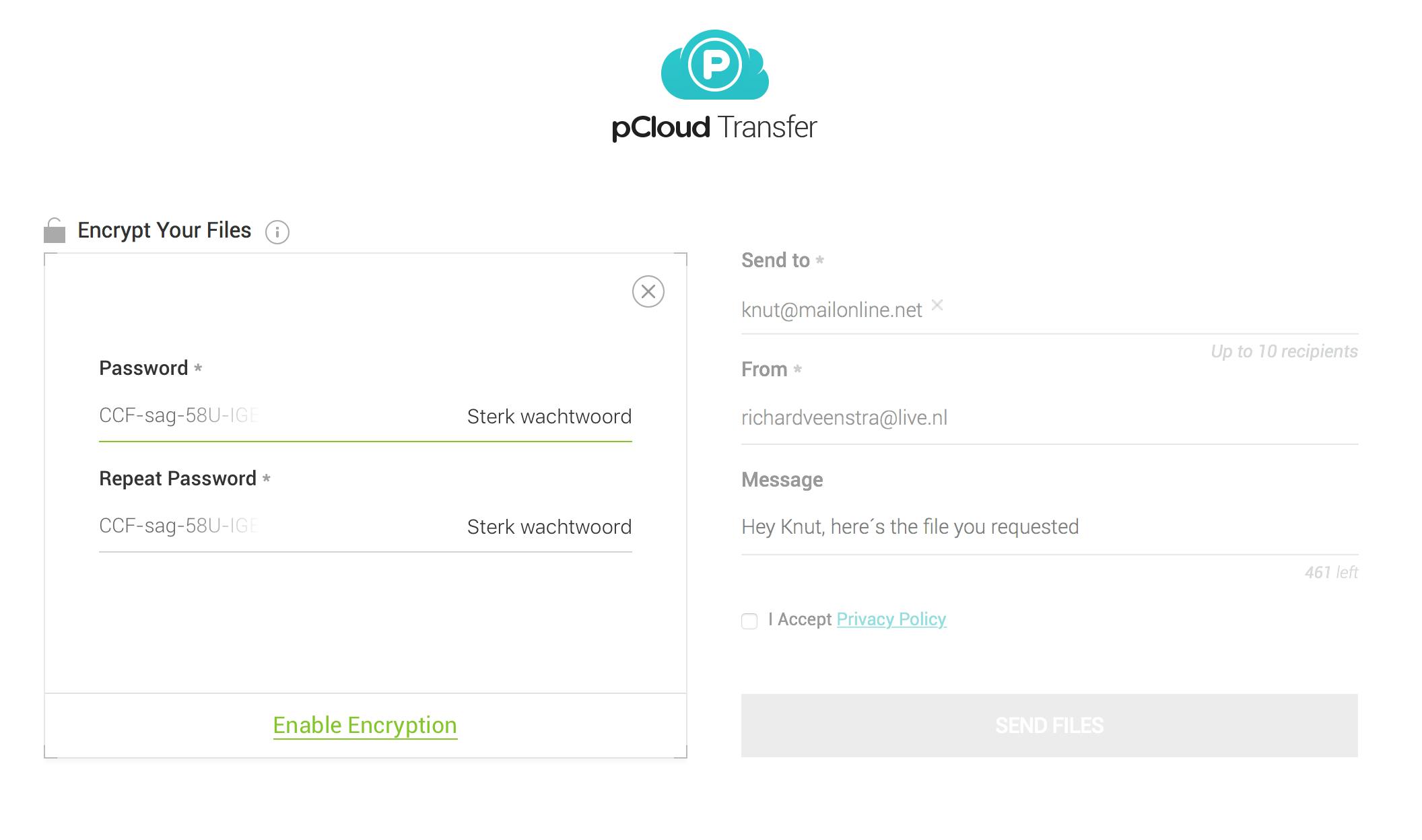 Een concurrent van WeTransfer is pCloud. Als je dat wilt, versleutelt de dienst je bestanden met een wachtwoord. Verstuur je af en toe een bestand tot 5 gigabyte dan surf je naar https://transfer.pcloud.com. Je kiest de ontvanger en selecteert het bestand. Bovenin heb je dan de optie om je bestand met een wachtwoord te beveiligen. Wil je vaker bestanden versturen, dan kun je een abonnement op pCloud nemen, dit is beschikbaar vanaf 3,99 euro per maand.