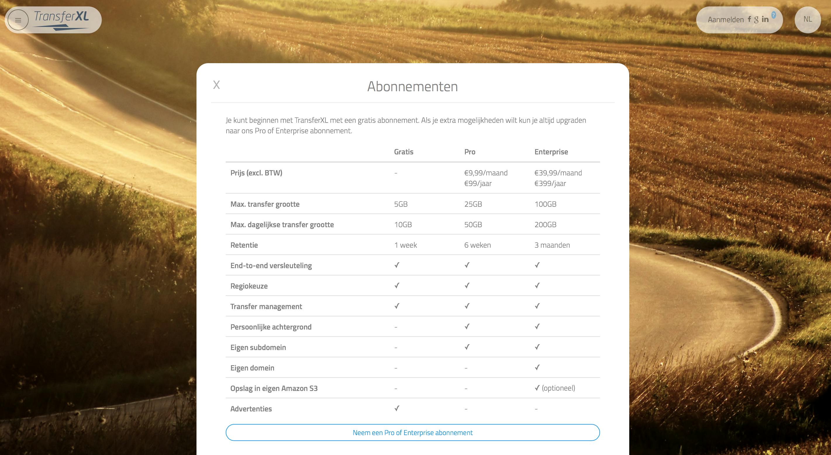 Wil je écht grote bestanden versturen, dan biedt TransferXL uitkomst. De XL geeft al aan dat de dienst enorm grote bestanden en mappen kan versturen, tot wel 100 gigabyte. Hiervoor moet je dan wel een betaald abonnement nemen overigens, met de gratis versie kun je tot 5 gigabyte versturen. Optioneel maak je gebruik van end-to-end encryptie. Bij de gratis versie blijven je bestanden één week op de servers van TransferXL staan.