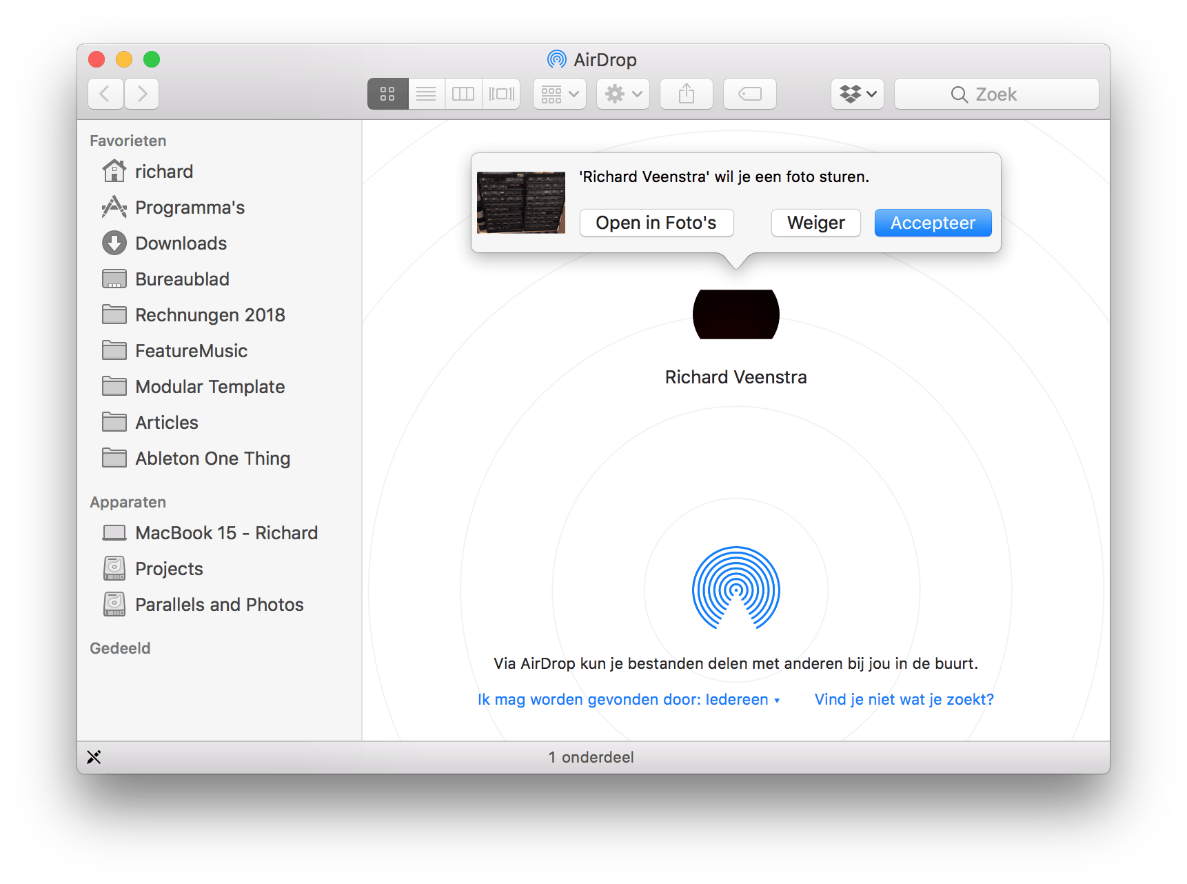 iOS- en Mac-gebruikers kunnen gemakkelijk bestanden delen tussen hun apparaten via AirDrop. Deze functie zit standaard in de besturingssystemen van Apple ingebouwd. Open AirDrop en je ziet in een oogopslag welke andere apparaten AirDrop aan hebben staan. Sleep een bestand naar één van de apparaten en de ontvangende partij krijgt een melding dat er een bestand binnenkomt. Deze hoeft het alleen nog maar te accepteren waarna de bestandsoverdracht begint.