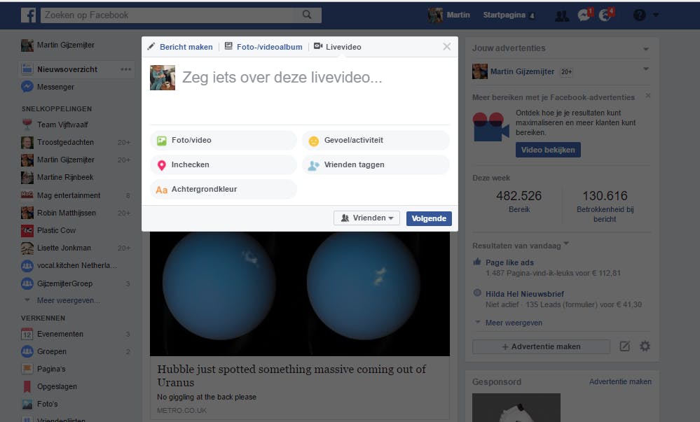 Eén van de leukste nieuwe mogelijkheden die sociale netwerken ons bieden zijn live-filmpjes. In plaats van dat je een video opneemt, zend je live uit zodat je vrienden kunnen meekijken. Meestal gebeurt dat met een smartphone, maar met een webcam kan het ook prima. Om (ter illustratie) een live-video op Facebook te starten, klik je op Facebook op Livevideo in het kader Wat ben je aan het doen. Geef een beschrijving van de video en klik op Volgende. Zodra je nu op Toestaan drukt, ben je onmiddellijk live.