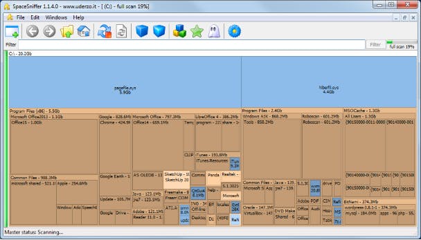 Hoe groot je schijf ook is, na verloop van tijd slibt iedere schijf dicht. Dan is het zoeken geblazen naar de grootste ruimteverbruikers. SpaceSniffer kan je daarbij helpen. Deze tool plot namelijk het schijfgebruik voor je uit: hoe groter de bestanden en mappen, hoe groter het vak waarmee ze worden afgebeeld.