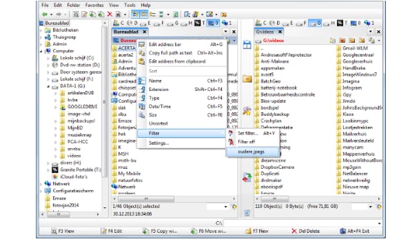 Een van de opvallendste uitbreidingen is dat FreeCommander XE standaard twee panelen heeft waarbinnen je kunt navigeren, wat verplaats- en kopieerhandelingen vergemakkelijkt. Handig zijn ook de ingebouwde weergavefilters inclusief ondersteuning voor reguliere expressies, waardoor je snel kunt inzoomen op data van bijvoorbeeld een bepaalde grootte, type of leeftijd. En voor wie geregeld zijn webruimte raadpleegt: dat vergt weinig moeite dankzij de ingebouwde ftp-client.