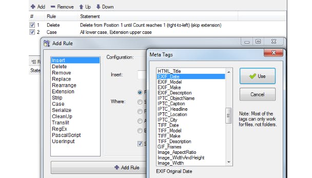 Die regels kunnen behoorlijk complex worden. Zo is het mogelijk (in één enkele run) bijvoorbeeld de eerste twee tekens weg te halen en te vervangen door een oplopend nummer, de extensie in hoofdletters te plaatsen en net voor de extensie metatags als de datum uit de exif-info (EXIF_Date) in te voegen. Het kan overigens nog krachtiger, want ReName kan met reguliere expressies en met een Pascal/Delphi-achtig script overweg.