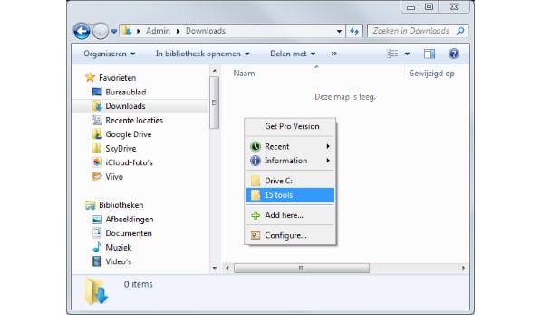 Wil je naar een diep geneste map navigeren via de verkenner, dan vergt dat flink wat muisklikken. Dat is niet efficiënt, maar Direct Folders helpt je. Dubbelklik je na de installatie op een lege plaats in een verkenner-venster of in een dialoogvenster dat hoort bij Opslaan (als), dan verschijnt een pop-up waarin je favoriete mappen in een lijst staan. Natuurlijk voeg je die mappen wel eerst aan het menu toe. Dat doe je via de optie Add here, waarbij Direct Folders het pad naar de huidige map al voor je heeft ingevuld. Het is ook nog mogelijk zelf een ander pad in te tikken.
