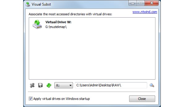Wie al lang(er) met pc's bezig is, herinnert zich misschien nog het oude DOS-commando 'subst', waarmee je een pad aan een virtuele stationsletter koppelde. Dat is precies wat Visual Subst voor je doet, alleen bevindt het commando zich hier in een verzorgde en gebruiksvriendelijke interface. Je geeft aan welke (diep geneste?) map je aan welke stationsletter wilt koppelen en klaar. Die map is voortaan bereikbaar als een virtueel station, vanuit de verkenner. Als je dat zo instelt, onthoudt Visual Subst die koppeling ook over verschillende Windows-sessies heen.