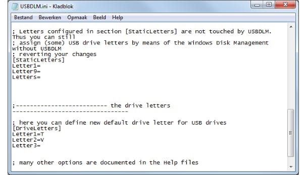 Daarna hernoem je usbdlm_sample.ini in usbdlm.ini en bewerk je het configuratiebestand. Het volgende voorbeeld zorgt ervoor dat Windows de letters T en V voor je usb-sticks zal gebruiken.