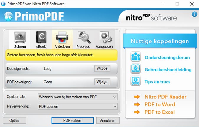 Windows 10 heeft eindelijk de mogelijkheid om pdf's te maken vanuit elk programma. Dit gaat via een virtuele printer genaamd Microsoft Print to PDF. Wie deze optie vaak gebruikt, loopt al snel tegen allerlei beperkingen aan. Met PrimoPDF kun je kwaliteitsinstellingen kiezen voordat je de pdf bewaart. Ook is het mogelijk om een bestaand pdf-bestand uit te breiden. Dit doe je door het op te slaan naar dezelfde bestandsnaam. Kies de optie Append om je huidige printopdracht toe te voegen aan het reeds bestaande pdf-bestand.