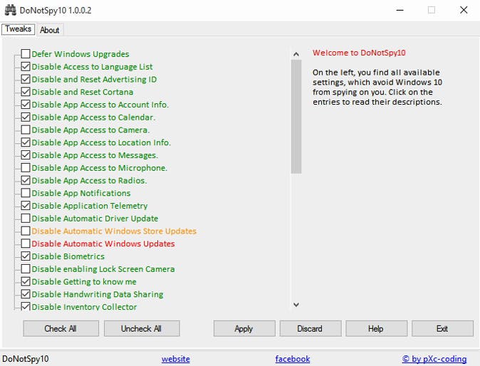 Windows 10 volgt de trend die al jaren zichtbaar is op de smartphonemarkt om steeds meer binnen te dringen in je persoonlijke leefomgeving. Er wordt veel informatie verzameld en doorgestuurd. Hoeveel je blootgeeft kun je wijzigen en inzien via Start / Instellingen / Privacy, maar dit overzicht is niet compleet. DoNotSpy10 gaat verder en toont alle opties die te maken hebben met privacy en tracking. Je kunt de opties bekijken en uitschakelen. De groene instellingen zijn redelijk veilig uit te schakelen, oranje opties vereisen aandacht voordat je ze deactiveert en rode instellingen kun je beter niet wijzigen.