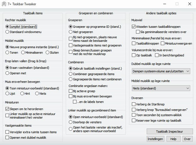 De taakbalk van Windows 10 is handig. Je kunt je favoriete programma's erop plaatsen en hiervandaan starten. Ook geopende programma's krijgen er een plekje, al dan niet gegroepeerd. Dankzij 7+ Taskbar Tweaker krijgt je taakbalk meer mogelijkheden die je misschien niet nodig dacht te hebben, maar wel erg handig zijn! Je kunt bijvoorbeeld het gedrag van de items op je taakbalk beïnvloeden, onderdelen omdraaien of de pictogrammen meer ruimte geven. Ook kun je onderdelen groeperen (of juist niet) en speciale acties instellen als je dubbelklikt op de lege ruimte.