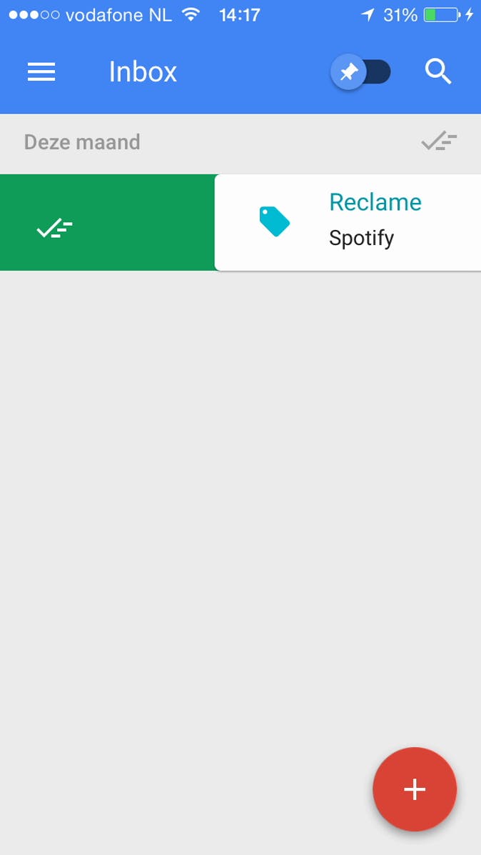 Nu komt het vervelendste klusje ... of juist het leukste. Je kunt e-mails per groep archiveren. Zorg wel dat je al je e-mail gelezen hebt voor je hieraan begint, misschien sleep je een belangrijk mailtje anders per ongeluk in een verkeerde groep en kun je hem niet meer terugvinden. Swipe een bericht of een groep berichten naar rechts om alles binnen die groep in de bijbehorende map te zetten. Zo verdwijnen in één klap alle updates van Facebook en Twitter onder Sociaal, en daarna alle berichten van je bank en de belastingdienst in Financieel.