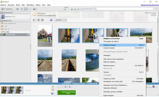 Een camera of smartphone kun je op meerdere manieren vasthouden. Toch staat het beeld altijd netjes rechtovereind als je de foto's op je pc bekijkt, je camera 'voelt' hoe je hem houdt. Alhoewel, soms gaat het toch mis. Dan ligt een foto op z'n kant of staat hij zelfs ondersteboven. Corrigeren in Picasa is gelukkig eenvoudig. Klik met rechts op de foto en kies Rechtsom draaien of Linksom draaien. Is bij meerdere foto's hetzelfde fout gegaan? Selecteer ze dan in het miniaturenoverzicht zodat ze allemaal tegelijk geroteerd worden en je het niet per stuk hoeft te doen. Lees ook: Al je foto's bewerken doe je gratis met deze 20 fotoprogramma's.