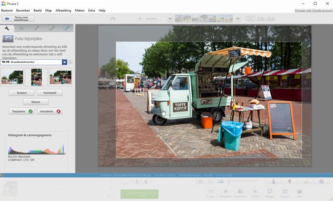 Zet je het gereedschap Bijsnijden op handmatig, dan bepaal je zelf welke verhouding de uiteindelijke foto krijgt. Je wijkt dan al snel af van de standaardformaten die foto's hebben. Foto's van smartphones, tablets en compactcamera's hebben namelijk nagenoeg altijd een verhouding van 4 staat tot 3 en die van spiegelreflexcamera's 3 staat tot 2. Op zich is dat niet erg, behalve wanneer je foto's schermvullend wilt zien of ze op fotopapier moeten passen. In dat geval kun je beter de gewenste beeldverhouding opgeven in Picasa. Bijvoorbeeld 16:9: HDTV of 4:3: Standaardscherm. Maak je nu een selectie, dan krijgt het kader vanzelf de juiste verhouding.