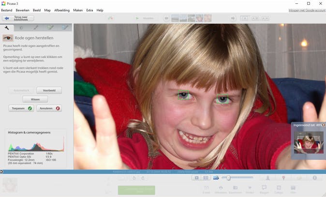 Je kent het wel: maak je een prachtige portretfoto, wordt hij ontsierd door lelijke rode ogen. Jammer. Je zou hem bijna weggooien, maar doe dat maar niet. Die rode ogen worden veroorzaakt door de flitser en je kunt het effect gelukkig eenvoudig verhelpen met Picasa. Kies Rode ogen en sleep met ingedrukte linkermuisknop over elk oog. Er verschijnt een kader omheen en zodra je de muisknop loslaat, wordt het rood uit de ogen weggehaald. Als je geluk hebt, herkent Picasa de ogen zelfs helemaal zelf en wordt de foto hersteld zonder dat je de ogen met de muis hoeft te markeren.