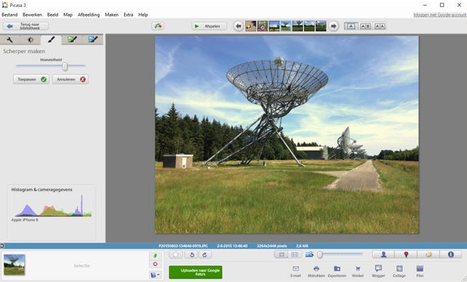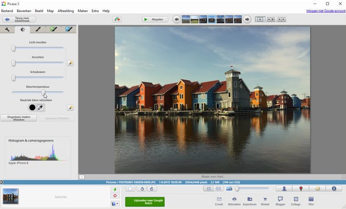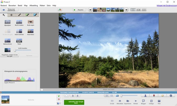 Vaak houden we - zonder er erg in te hebben - de camera of telefoon een beetje schuin, zodat we een scheve foto krijgen. Soms valt dat niet eens op, maar als er rechte lijnen of een horizon in de foto te zien zijn, staat het toch niet zo mooi. Gelukkig kent Picasa de functie Recht maken. Via een schuifregelaar draai je de foto de ene of de andere kant op, zodat je hem perfect recht kunt zetten. Om dat makkelijker te maken, toont het programma een raster. Zo kun je een muur, vloer of de horizon nog beter uitlijnen.