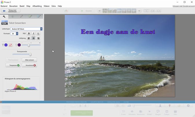 Staat een tekst net niet op de juiste plek? Geen probleem. Klik erop zodat er een kader omheen verschijnt. Zodra je de muis boven dit kader laat zweven, kun je de tekst met ingedrukte muisknop vrij over de foto verplaatsen. Beweeg je de muis naar het midden van het kader, dan verschijnt een cirkel met aan de rechterzijde een wijzer met een knopje. Klik op dit knopje en sleep met ingedrukte muisknop omhoog of omlaag om de tekst schuin te zetten. Beweeg naar links of naar rechts om de tekst te schalen, dus groter of kleiner te maken.