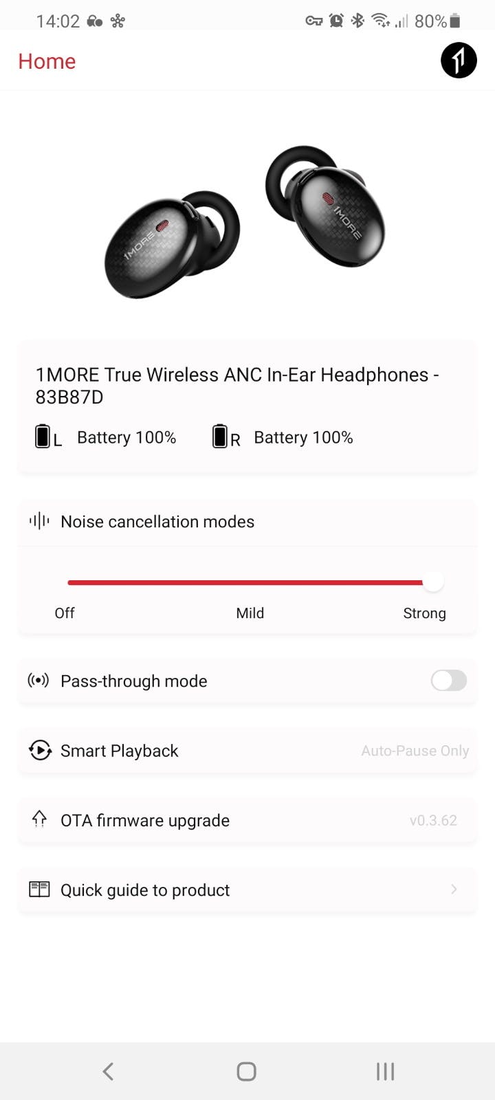 Het is dus even pielen en uitproberen totdat je de 1More-oortjes goed en wel op maat hebt. Verbinden doe je via de bluetooth-instellingen van je mobiele apparaat, of via de 1More-app voor Android en iOS. Via de app kun je niet de geluidsinstellingen tunen met een equalizer. Wel kun je zoeken naar updates, de batterijstatus bekijken en noise cancelling of pass through in- of uitschakelen.