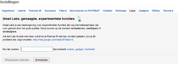 Gmail Labs is het gedeelte binnen Gmail waar experimentele functies worden aangeboden. Dit zijn functies die superhandig zijn, maar wellicht niet voor iedereen geschikt of niet voldoende getest om onderdeel te laten zijn van de standaard Gmail-ervaring. Daarom geeft Google iedereen via Labs de mogelijkheid om zelf te bepalen welke functies gewenst zijn en welke niet.