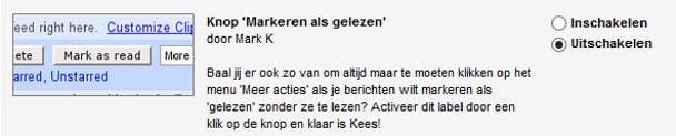 Wanneer je veel mail ontvangt, dan is de kans dat het een rommeltje wordt vrij groot. Gelukkig vind je in Gmail een knop waarmee je de berichten als gelezen kunt bestempelen, echter, daar moet je wel eerst voor op een andere knop drukken. Wanneer je de optie Knop 'Markeren als gelezen' inschakelt in Gmail Labs, dan verschijnt er een knop in de Gmail interface waarmee je direct berichten als gelezen kunt bestempelen. Scheelt toch net even weer een extra klik.