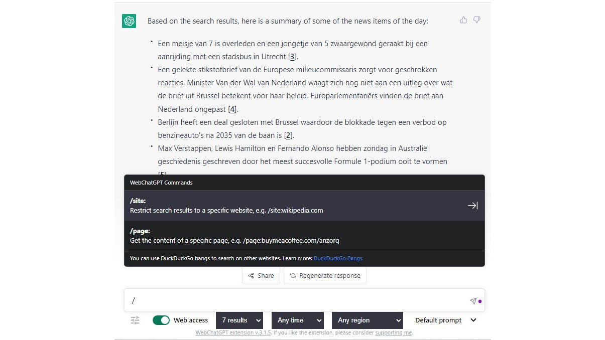 We kunnen niet om het razend populaire ChatGPT heen en de eerste vijf extensies draaien helemaal rond deze intelligente chatbot. In tegenstelling tot bijvoorbeeld Bing Chat of Google Bard kan ChatGPT vooralsnog geen actuele informatie uit het web opdiepen. Met WebChatGPT is dit wel mogelijk. Je ChatGPT-invoerbalk krijgt dan meteen enkele knoppen bij, waarbij je zelf aangeeft hoeveel webbronnen de tool moet raadplegen, binnen welke periode en in welke regio. WebChatGPT maakt hiervoor gebruik van DuckDuckGo. Je kunt ook specifieke sites en DuckDuckGo Bangs aanspreken, bijvoorbeeld met /page:<webpagina> <zoekterm> of /!<bang> <zoekterm>. Zorg er wel voor dat de knop Web access is ingeschakeld.