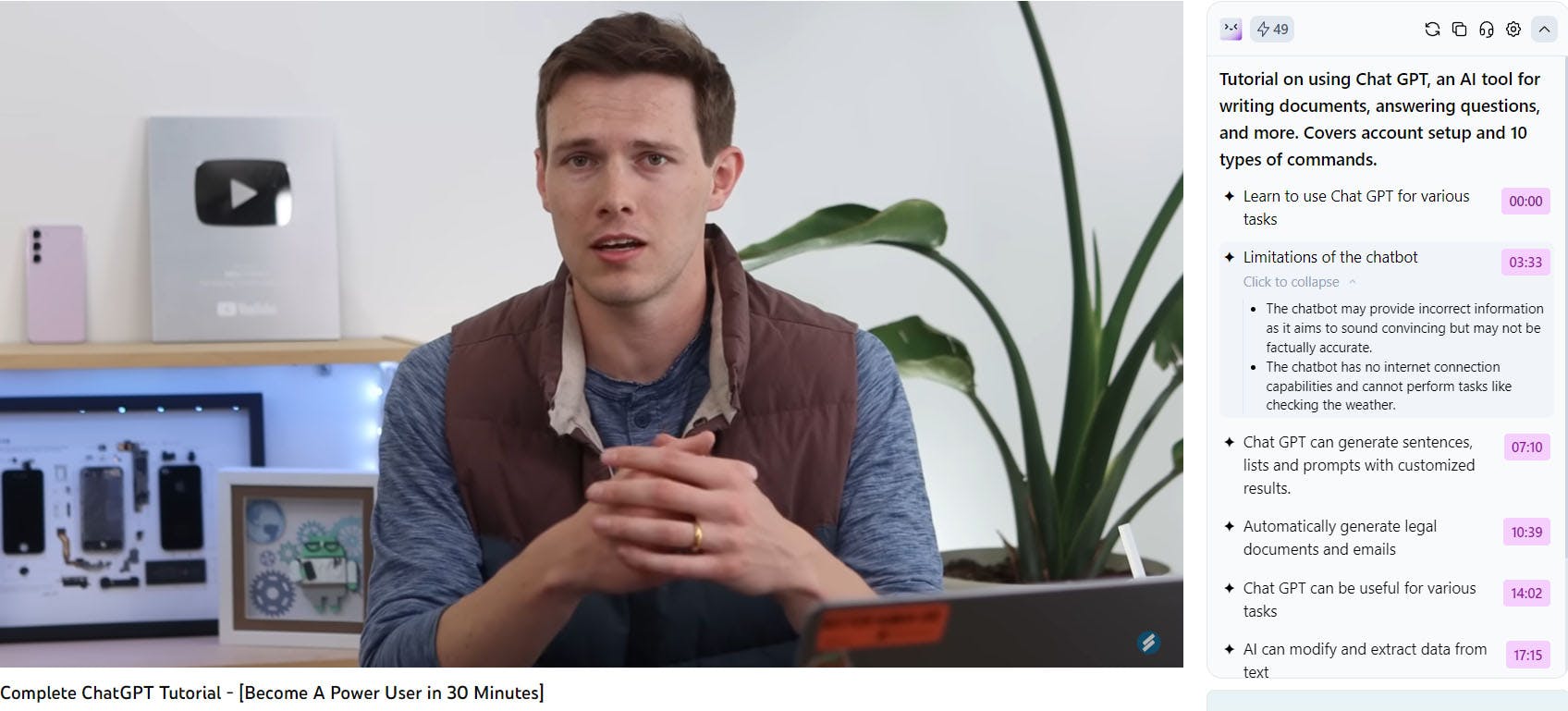 Merlin omschrijft zichzelf als een ChatGPT-assistent voor alle websites. Wanneer je namelijk na je aanmelding bij Merlin op Ctrl+M drukt, verschijnt een pop-upvenster met een ChatGPT-prompt. Het antwoord kun je naar het klembord kopiëren en het is tevens mogelijk je prompts te bewaren. Ook handig: wanneer je een YouTube-video bekijkt, volstaat een klik op Summarize this video voor een mooi overzicht van wat er in de video te zien is, op basis van het bijbehorende transcript. In de gratis versie ben je beperkt tot 51 dagelijkse prompts. Kies je voor GPT-4, dan vreet één vraag wel meteen 10 prompts op.