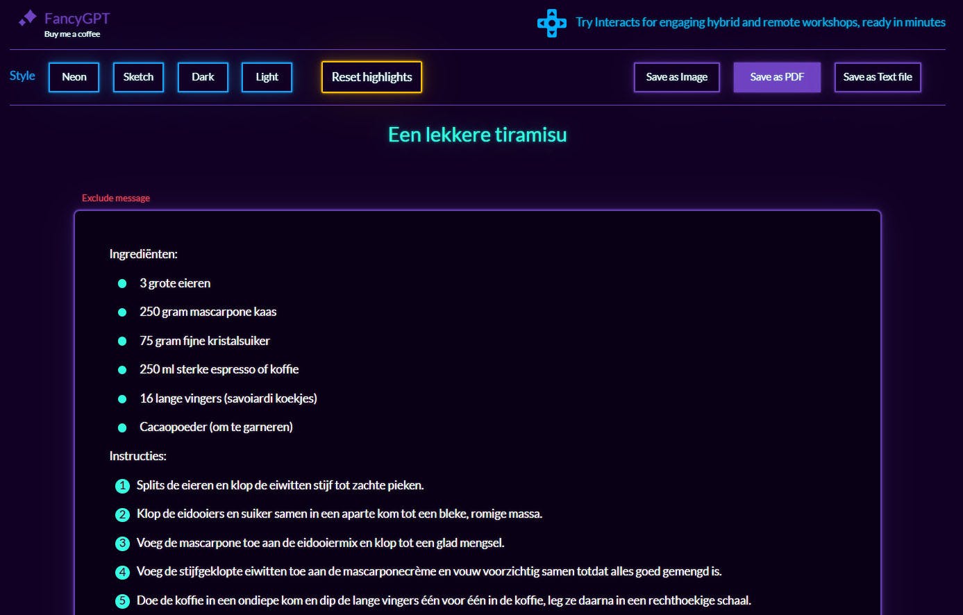 De antwoorden van ChatGPT zijn behoorlijk indrukwekkend, maar de lay-out beperkt zich overwegend tot ‘platte tekst’, hooguit met een tabel of woorden in cursief of vetgedrukt. Echt ‘fancy’ oogt zo’n respons dus niet, maar FancyGPT stopt alles in een fraaier jasje. Zodra de conversatie klaar is, open je de extensie en klik je op Make your ChatGPT fancy. Je belandt in een eenvoudige editor waar je een geschikte stijl selecteert (zoals Neon, Sketch en Light), eventueel een extra titel invult en de onderdelen van de chat aanklikt die je liever buiten het resultaat houdt. Ten slotte bewaar je het resultaat als afbeelding, pdf of tekstbestand. Deze extensie alleen beschikbaar voor Chromium-browsers.