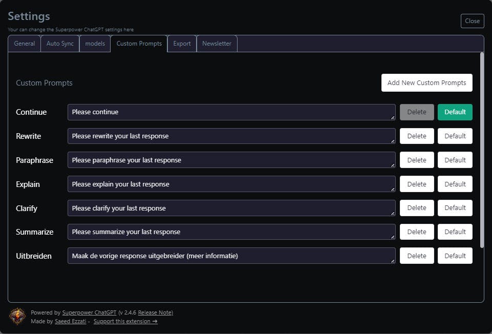 Net boven de promptbalk kun je uit diverse commando’s kiezen die inwerken op de vorige response, zoals Rewrite, Expand en Summarize. Via Settings kun je deze commando’s aanpassen en ook allerlei opties instellen.