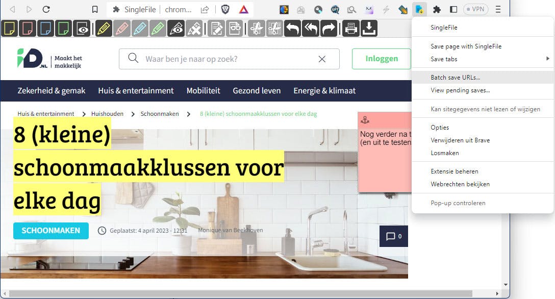 Als je een webpagina lokaal wilt bewaren vanuit je browser, worden alle pagina-objecten standaard opgeslagen in afzonderlijke bestanden. Als je alles liever in één bestand wilt hebben (wanneer een schermafbeelding niet voldoet), regelt SingleFile dit voor je. Met één druk op de knop kun je het resultaat even later als lokale html-pagina bekijken, inclusief css, fonts, frames, afbeeldingen, enzovoort. Er zijn nog meer opties beschikbaar via het contextmenu, zoals Save Selected Links, Annotate and Save the page, Auto-save enzovoort.