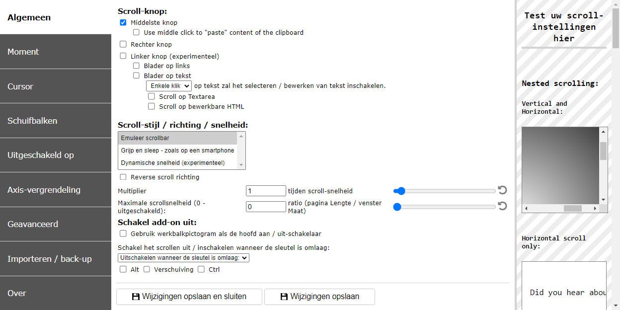 Met ScrollAnywhere kun je de navigatie op webpagina’s aanzienlijk verbeteren. Je kunt namelijk scrollen in alle richtingen, ongeacht de positie van de muis, door middel van een muisknop naar keuze. Je bent dus niet langer beperkt tot de standaard scrolbalken, wat met name handig is bij het bekijken van grote afbeeldingen of lange tabellen. Hoewel het lijkt alsof het een eenvoudig hulpje is, biedt het veel instelbare opties. Zo kun je de snelheid, versnelling en het uiterlijk van de cursor tijdens het scrollen aanpassen, de grootte en kleur van de scrolbalken wijzigen en nog veel meer.