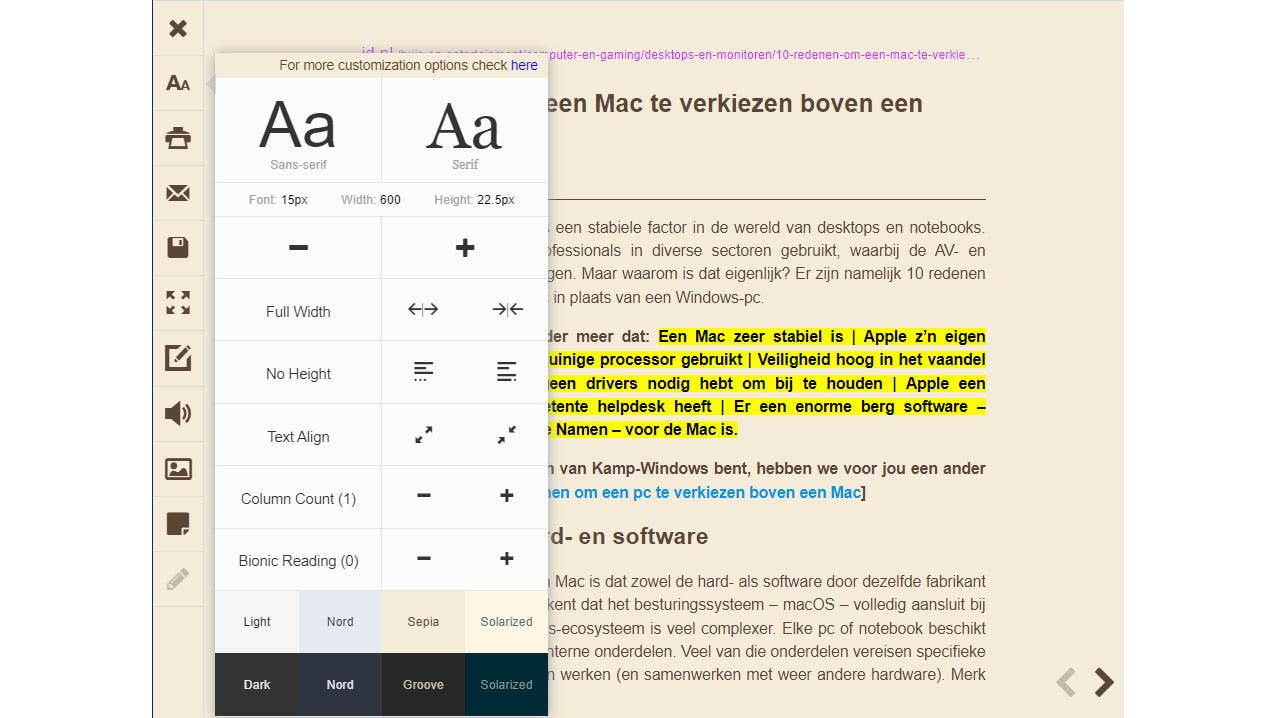Reader View is een handigere optie voor browsers dan de ingebouwde leesmodus. Door op de Reader View-knop te klikken bij het openen van een webpagina met afbeeldingen en advertenties, wordt alleen de tekst weergegeven in een gemakkelijk leesbare lay-out. Als je de afbeeldingen toch wilt bekijken, kun je deze met één klik weergeven. Reader View biedt ook de mogelijkheid om tekst te verwijderen, bewerken, markeren of toe te voegen en om de tekst te laten voorlezen, ook in het Nederlands. Je kunt de fontgrootte en achtergrondkleur aanpassen en het document gemakkelijk afdrukken, opslaan (als html) of direct verzenden naar je standaard e-mailprogramma.